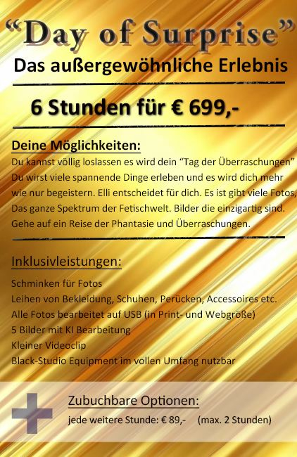 Have you ever dreamed of leaving your everyday life behind and stepping into a world filled with countless sensual, thrilling, and mysterious experiences? That’s exactly what our “Day of Surprise” offers! There’s only one thing you need to do: let go and follow me with complete trust.