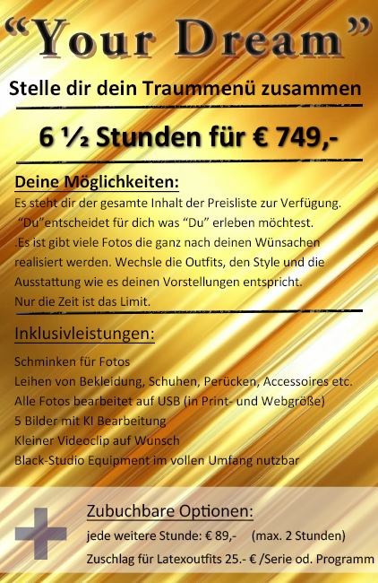 Imagine having 6½ hours (extendable by up to 2 additional hours!) to bring all your fantasies, ideas, and wishes to life. That’s exactly what our “Your Dream” program offers. You decide on the schedule, and we ensure your ideas become reality to the fullest extent technically possible.