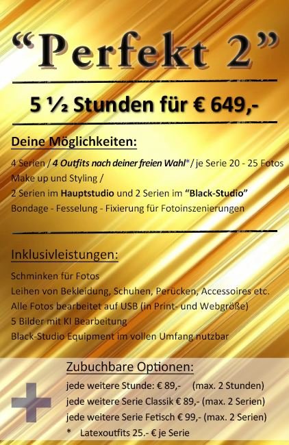 Bereit, deine verführerische, dominante oder ganz natürliche Seite zum Vorschein zu bringen? Dann warte nicht länger! Sichere dir jetzt deinen Termin für das Programm „Perfekt 1“ und erlebe ein Fotoshooting, das garantiert in Erinnerung bleibt.