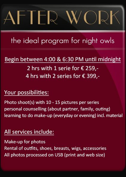 The programme starts at any time between 4:00 pm and 6:30 pm and ends at 10:30 pmat the latest. ‘After Work’ includes 1 photo series in the 2 hours, 2 photo series with 10 - 15 pictures each in the 4 hours and of course our inclusive services. As an alternative or in addition to the photo shoot, you can also learn make-up, experience various outdoor activities en femme or have an informal chat with me, in which I will give you expert advice on all transgender issues.