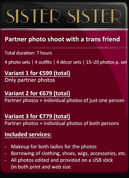 Have you always wanted to have photos together with a dear trans friend? The ‘Sister Sister’ programme is the ideal programme for your partner shoot. It lasts 7 hours and includes four photo series, four different outfits and four decoration sets. There are 15 - 20 pictures from each series.