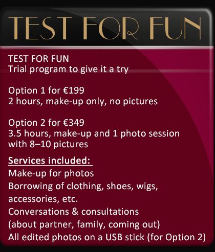 It's that simple: Search for a free appointment and send me an email. I will style you completely as a woman with everything that goes with it - from perfect make-up to clothes and shoes to painted fingernails. If you like, we can also take a few souvenir photos of the result with option 2. You can use these photos to amaze friends and acquaintances - if you want to, of course - or apply to the theatre club for the female role :-).