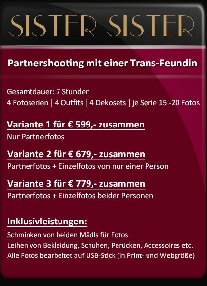 Du wolltest schon immer mit einer lieben Transfreundin gemeinsame Fotos haben? Das Programm "Sister Sister" ist das ideale Programm für euer Partnershooting. Es dauert 7 Stunden und beinhaltet vier Fotoserien, vier unterschiedliche Outfits sowie vier Dekosets. Von jeder Serie gibt es 15 - 20 Bilder.